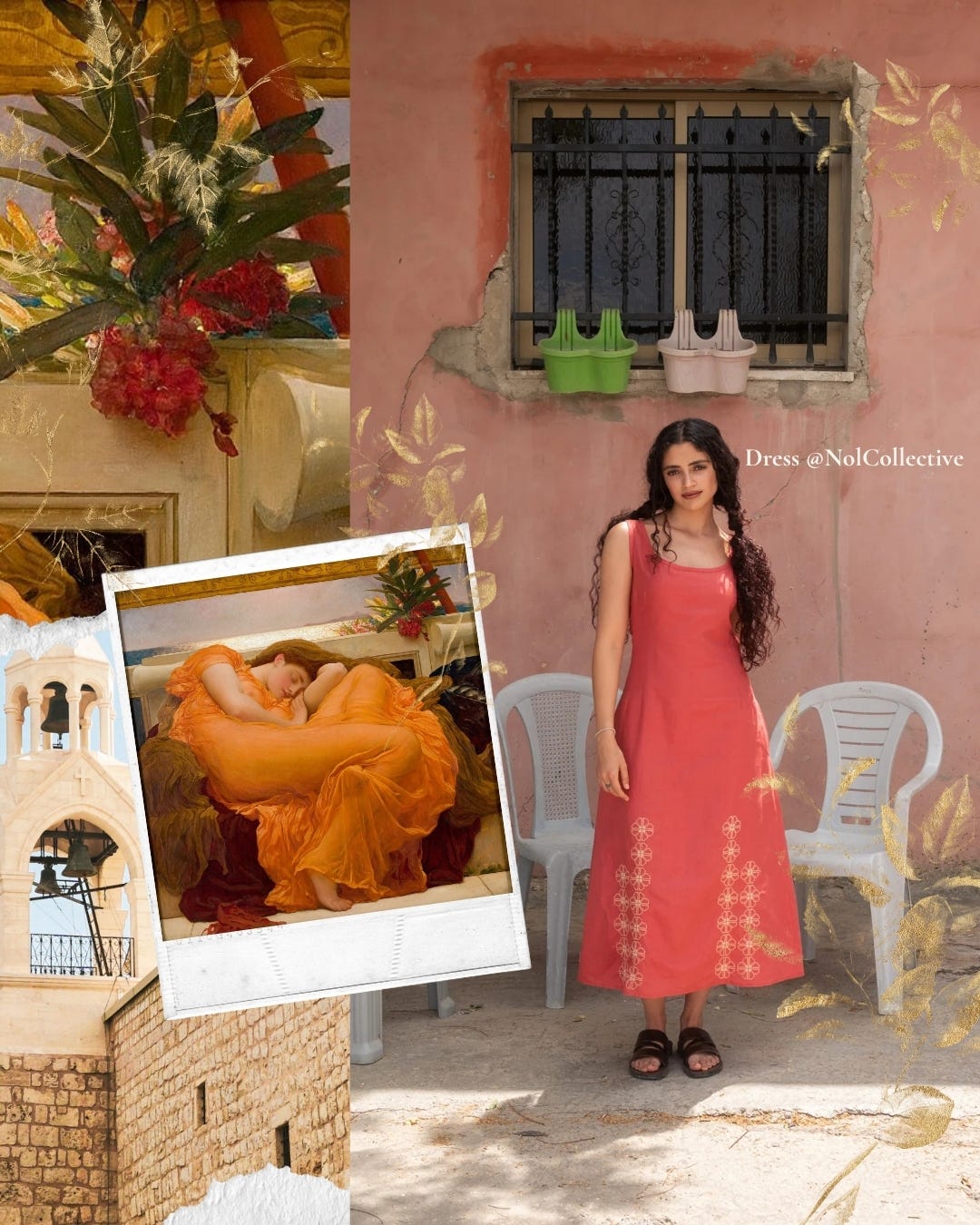 My second choice for this Flaming June edit is the Farah Midi Dress in Saffron by Nol Collective that radiates with the exact hue of Frederic Leighton’s sleeping muse. It exudes that same hypnotic, sun-drenched orange that feels like the final sigh of a golden summer.
